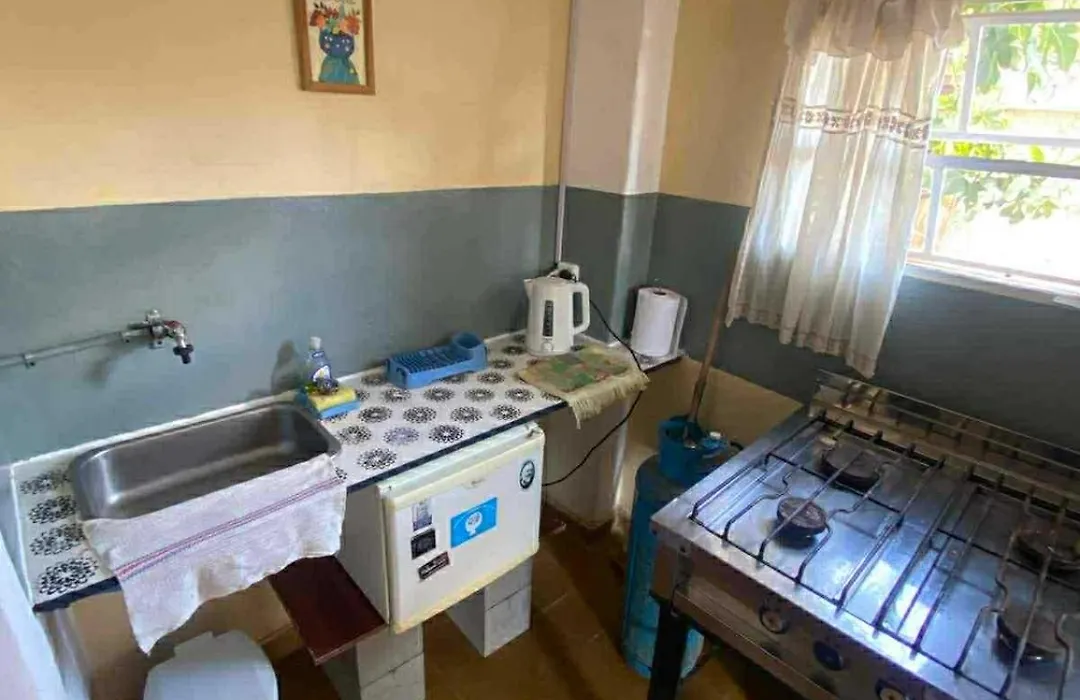 Yes, this apartment is furnished with a kitchen and offers a fridge, an oven, and kitchenware as well.